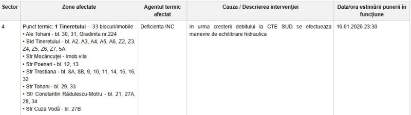 Caloriferele erau în continuare reci sau cel mult călduțe în zonă, așa că a fost consultat și site-ul Companiei Municipale Termoenergetica (cmteb.ro). Acolo, la secțiunea „funcționare sistem de termoficare” a fost găsit mesajul „În urma creșterii debitului la CTE SUD se efectuează manevre de echilibrare hidraulică”, cu termen de soluționare 16 ianuarie 2026, ora 23.30.