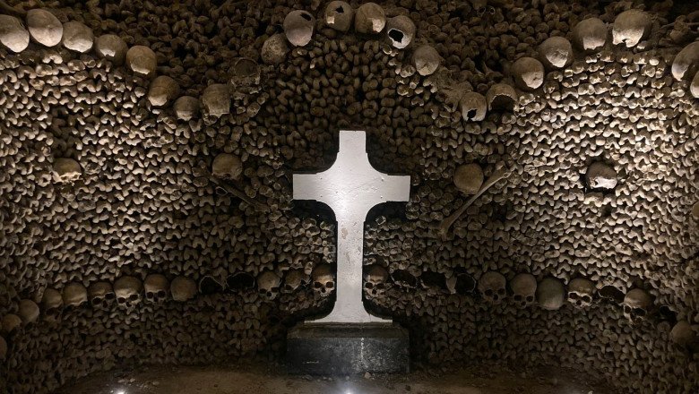 Prin urmare, începând din 1786, Primăria locală a mutat rămăşiţele a aproximativ 6 milioane de oameni în carierele de calcar abandonate din sudul Parisului – adânc sub pământ. Începând din 1810, craniile şi oasele au fost aşezate în straturi pentru a forma pereţi şi au fost împodobite cu inscripţii şi citate filosofice.