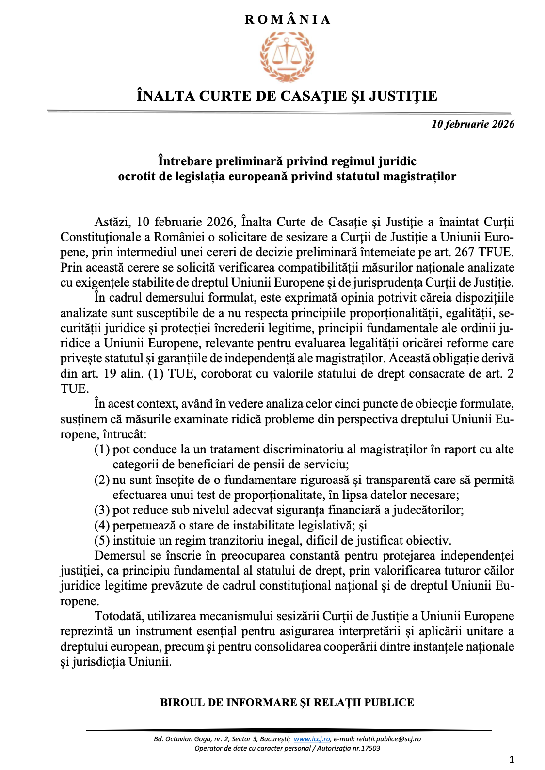 „Astăzi, 10 februarie 2026, Înalta Curte de Casație și Justiție a înaintat Curții Constituționale a României o solicitare de sesizare a Curții de Justiție a Uniunii Europene, prin intermediul unei cereri de decizie preliminară întemeiate pe art. 267 TFUE.