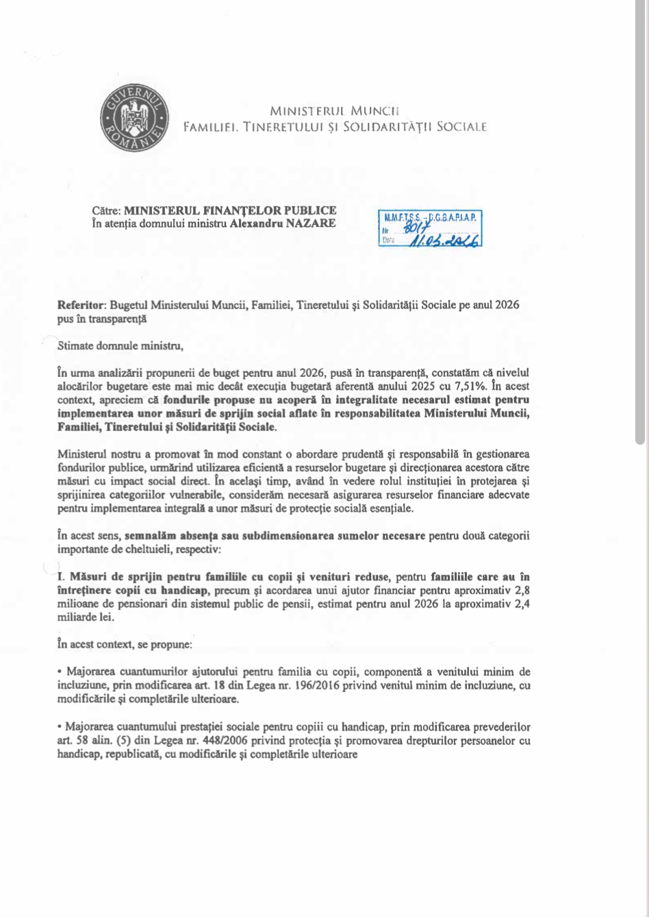 Ministerul nostru a promovat în mod constant o abordare prudentă și responsabilă în gestionarea fondurilor publice, urmărind utilizarea eficientă a resurselor bugetare și direcționarea acestora către măsuri cu impact social direct. În același timp, având în vedere rolul instituției în protejarea și sprijinirea categoriilor vulnerabile, considerăm necesară asigurarea resurselor financiare adecvate pentru implementarea integrală a unor măsuri de protecție socială esențiale”, se arată în documentul transmis de Florin Manole către Ministerul Finanțelor.