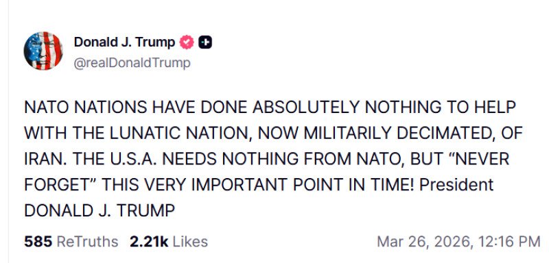 Donald Trump acuză statele membre NATO că „nu au făcut absolut nimic” pentru a ajuta în cazul Iranului, „o națiune nebună, acum decimată din punct de vedere militar”. „SUA nu au nevoie de nimic de la NATO, dar «nu uită niciodată» acest moment”, mai scrie acesta pe rețeaua sa Truth Social