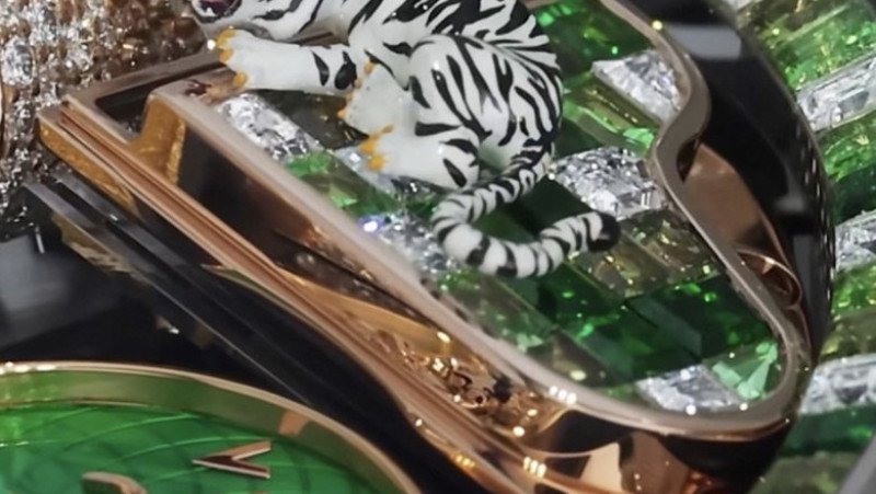 Ceasul este alcătuit din 397 de pietre prețioase, inclusiv diamante, safire verzi, granate și altele.