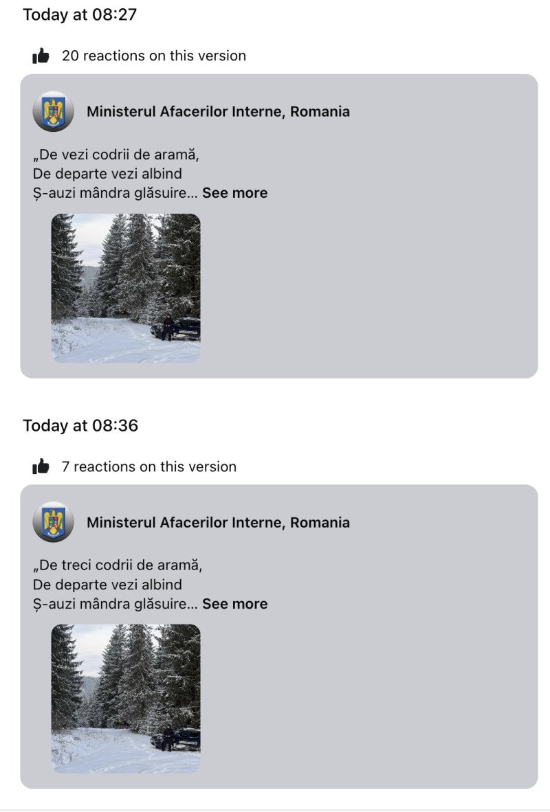 „De vezi codrii de aramă / De departe vezi albind / Ş-auzi mândra glăsuire/ A pădurii de argint.” Mihai Eminescu „De ce nu-mi vii””, este postarea inițială de pagina de Facebook a Ministerului Afacerilor Interne.
