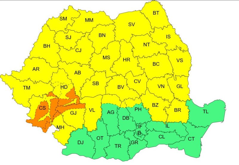 Totodată, meteorologii au emis o avertizare Cod galben, valabilă de duminică, de la ora 10.00, până luni, la aceeaşi oră, în judeţele Cluj, Mureş, Harghita, Sibiu, Alba, Hunedoara, Timiş, Caraş-Severin, Mehedinţi, Gorj, Vâlcea şi în unele zone ale judeţelor Argeş, Dâmboviţa, Prahova, Braşov, Bihor şi Arad.