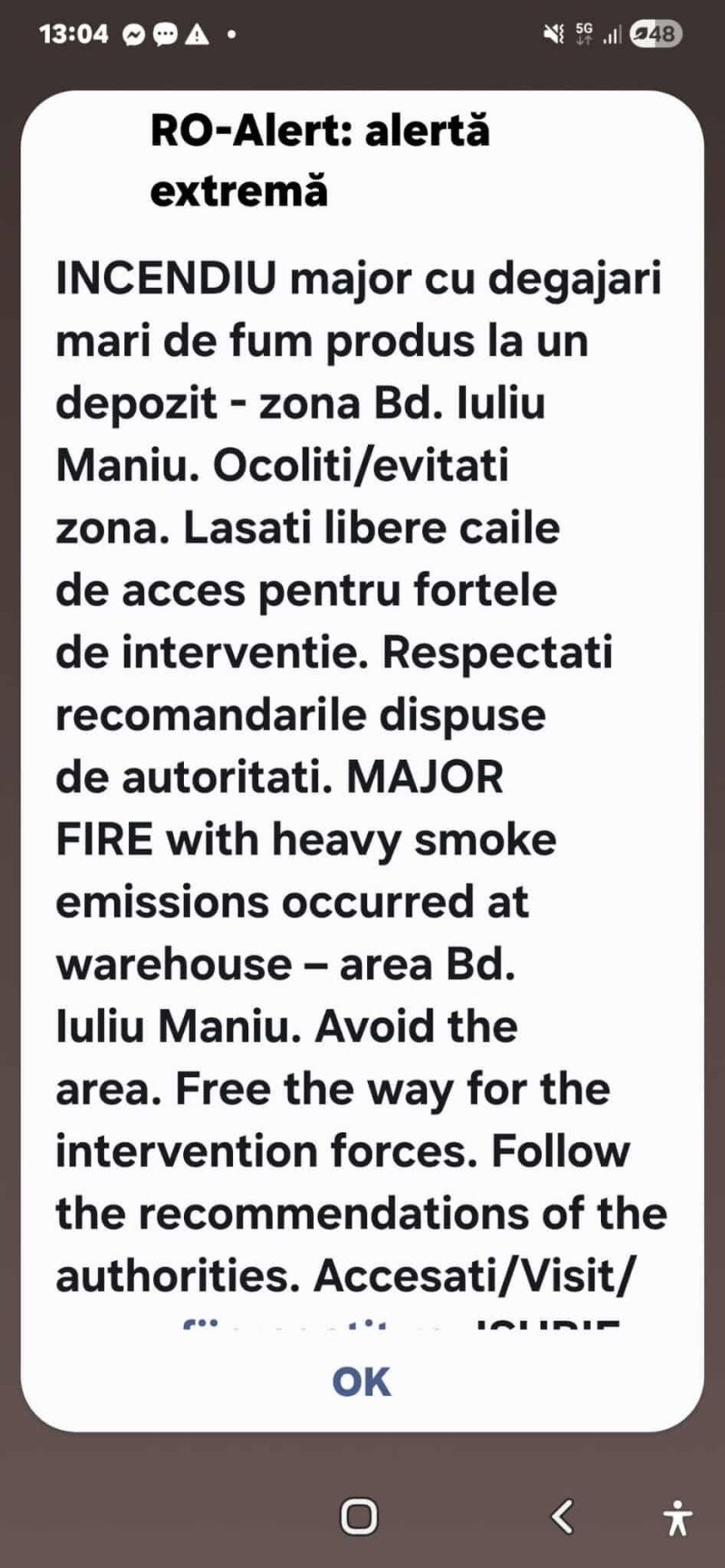 De asemenea, a fost trimis un mesaj RO-Alert pentru cetățenii aflați în zonă: „Incendiu major cu degajări mari de fum produs la un depozit – zona Bd. Ilia Maniu. Ocoliți/ evitați zona. Lăsați libere căile de acces pentru forțele de intervenție. Respectați recomandările dispuse de autorități”, se arată în mesaj.