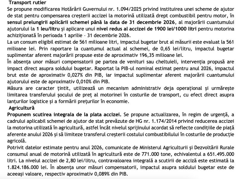 „Se propune modificarea Hotărârii Guvernului nr. 1.094/2025 privind instituirea unei scheme de ajutor de stat pentru compensarea creșterii accizei la motorină utilizată drept combustibil pentru motor, în sensul prelungirii aplicării schemei până la data de 31 decembrie 2026, al majorării cuantumului ajutorului la 1 leu/litru și aplicare unui nivel redus al accizei de 1900 lei/1000 litri pentru motorina achiziționată în perioada 1 aprilie – 31 decembrie 2026”, se mai arată în document.