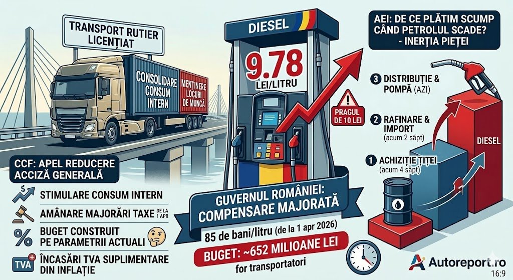 Analiza Autoreport.ro: Majorarea compensării la 85 de bani este o gură de oxigen pentru transportatori, dar lasă restul economiei și șoferii obișnuiți în bătaia vântului la pragul de 10 lei. Fără o reducere generalizată a accizei, așa cum sugerează CCF, costul transportului se va regăsi rapid în prețul tuturor produselor de la raft.