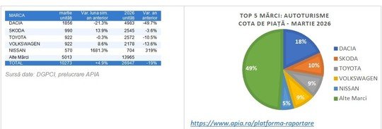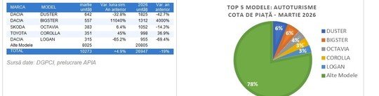 ”Datele privind evoluţia pieţei auto în luna martie 2026 indică o revenire moderată a înmatriculărilor de autoturisme noi, care înregistrează o creştere de +4,9% faţă de aceeaşi lună a anului trecut. Este un semnal pozitiv, într-un context care rămâne marcat de prudenţă în decizia de achiziţie şi de nevoia de predictibilitate în ceea ce priveşte politicile publice de susţinere a sectorului auto”, a declarat preşedintele APIA, Dan Vardie.