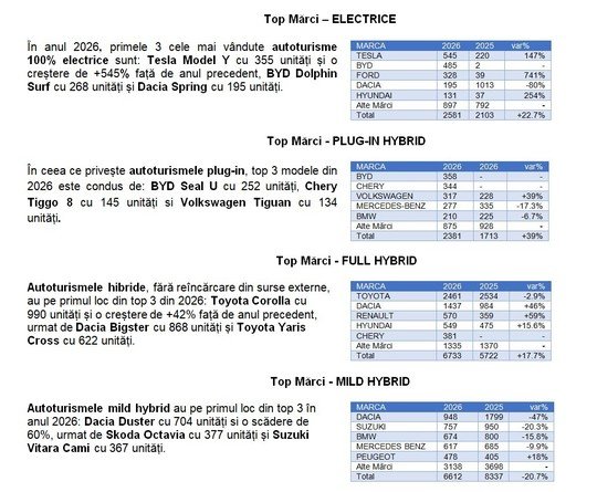 Sursa citată prfecizează că autoturismele “electrificate“, respectiv cele electrice (care pot fi încărcate din sursă externă de electricitate – BEV şi PHEV), precum şi cele mild-hibrid şi full hibrid (care dispun şi de propulsie electrică fără încărcare din sursă externă de electricitate) deţin, în luna martie a anului 2026, o cotă de piaţă de 65%, fiind cel mai important segment de pe piaţa românească, care depăşeşte cota deţinută de motorizările pe benzină şi motorină.
