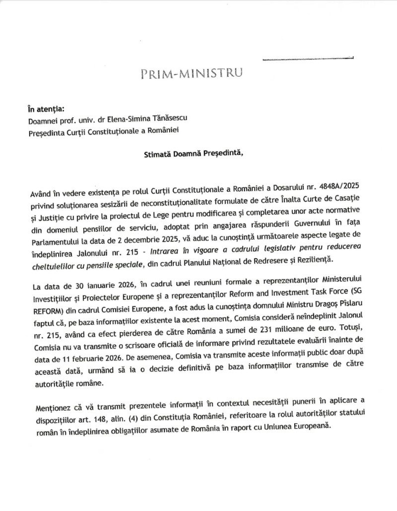 „Având în vedere existenţa pe rolul Curţii Constituţionale a României a Dosarului nr. 4848A/2025 privind soluţionarea sesizării de neconstituționalitate formulate de către Înalta Curte de Casaţie și Justiţie cu privire la proiectul de Lege pentru modificarea și completarea unor acte normative din domeniul pensiilor de serviciu, adoptat prin angajarea răspunderii Guvernului în fața Parlamentului la data de 2 decembrie 2025, vă aduc la cunoștință următoarele aspecte legate de îndeplinirea Jalonului nr. 215 Intrarea în vigoare a cadrului legislativ pentru reducerea cheltuielilor cu pensiile speciale, din cadrul Planului Național de Redresere și Reziliență. –