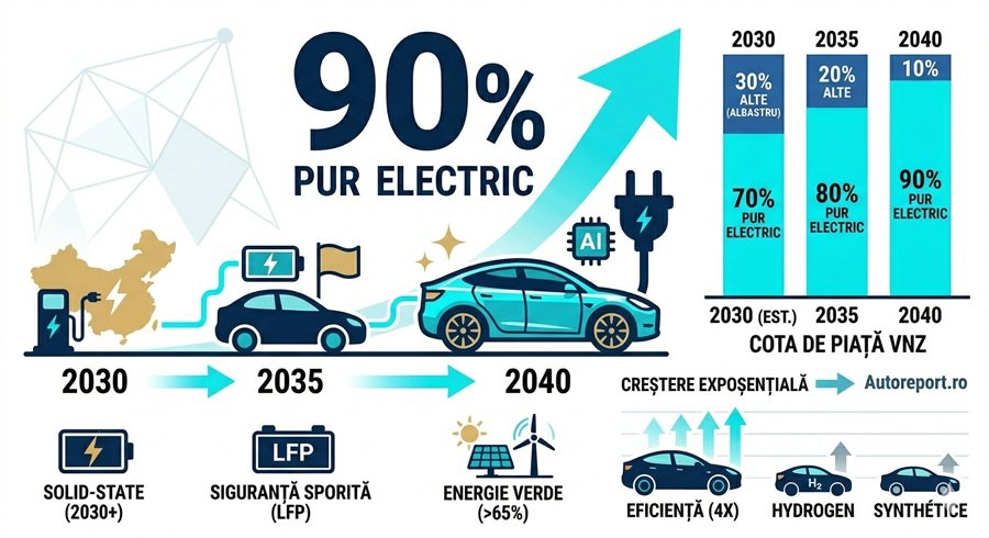 • 2035: Piața se va stabiliza la peste 80%, raportul devenind 8:2 în favoarea electricelor.
