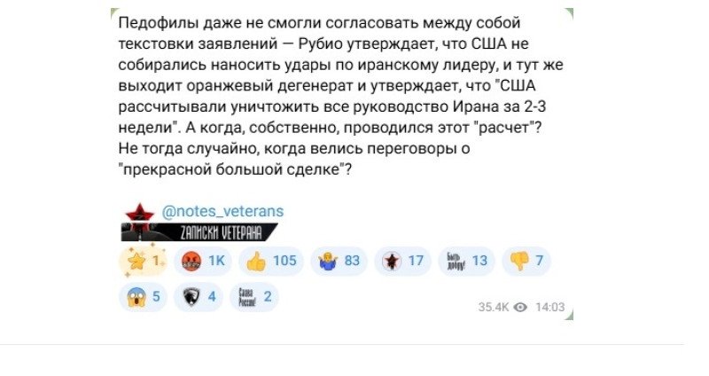 „Pedofilii nici măcar nu au putut să-și coordoneze declarațiile între ei! Rubio susține că SUA nu au planificat să lovească liderul iranian, iar imediat degeneratul roșcat iese și declară că SUA au planificat să distrugă întreaga conducere de vârf a Iranului în 2-3 săptămâni”, a scris canalul.