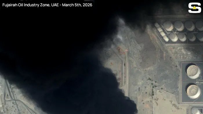 Imaginile din satelit arată un incendiu de amploare în zona instalațiilor petroliere Fujairah, Emiratele Arabe Unite, după un atac iranian de joi.