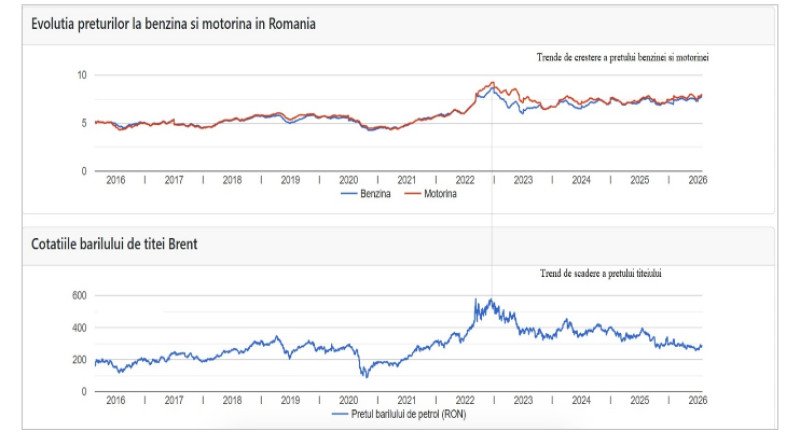 Explicația este creșterea accizei cu 77%, la care se adaugă alte taxe conexe, care au anulat complet efectul ieftinirii petrolului și au împins prețul final în sus. În perioada 2020–2026, prețul carburanților a devenit astfel mult mai dependent de fiscalitate și mult mai puțin de evoluția prețului petrolului.