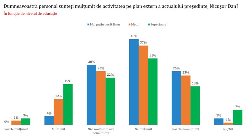 Doar 16% dintre respondenți se declară foarte mulțumiți sau mulțumiți de activitatea președintelui Nicușor Dan pe plant extern, în timp ce 34% spun că sunt nemulțumiți iar 21% foarte nemulțumiți de aceasta. Un sfert adoptă o poziție neutră. Cei mai nemulțumiți de activitatea pe plan extern sunt oamenii cu un nivel al educației până la liceu.