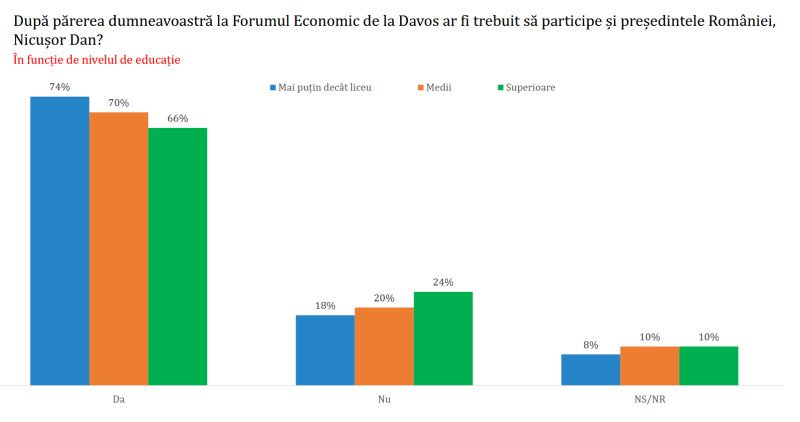 În schimb, există un consens mai larg în privința participării lui Nicușor Dan la Forumul Economic de la Davos, idee susținută de 69% dintre români. Doar 22% au fost împotrivă. Sprijinul pentru participare este de 74% în rândul persoanelor cu studii până la nivelul liceului, 70% în rândul celor cu studii medii și de 66% între cei cu studii superioare.