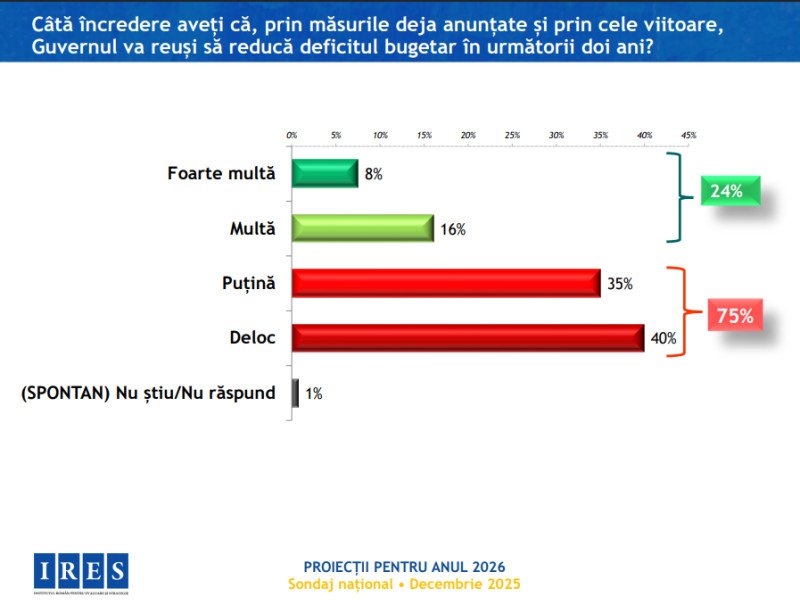 În pofida așteptărilor clare exprimate de populație, nivelul de încredere în capacitatea Guvernului de a gestiona dezechilibrele economice este foarte scăzut. Doar 24% dintre români declară că au multă sau foarte multă încredere că Executivul va reuși să reducă deficitul bugetar în următorii doi ani.