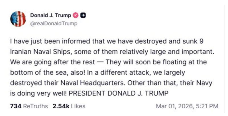 „Tocmai am fost informat că am distrus și scufundat nouă nave militare iraniene, unele dintre ele relativ mari și importante”.