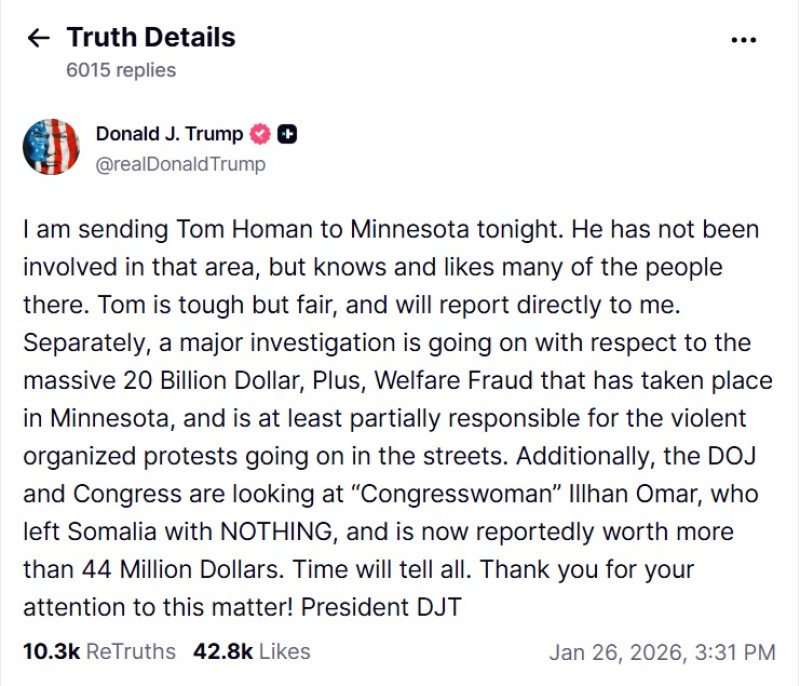 „Îl trimit pe Tom Homan în Minnesota în această seară. Nu a fost implicat în acea zonă, dar cunoaşte şi apreciază mulţi oameni de acolo. Tom este dur, dar corect, şi îmi va raporta direct”, a scris preşedintele american pe reţeaua sa Truth Social.