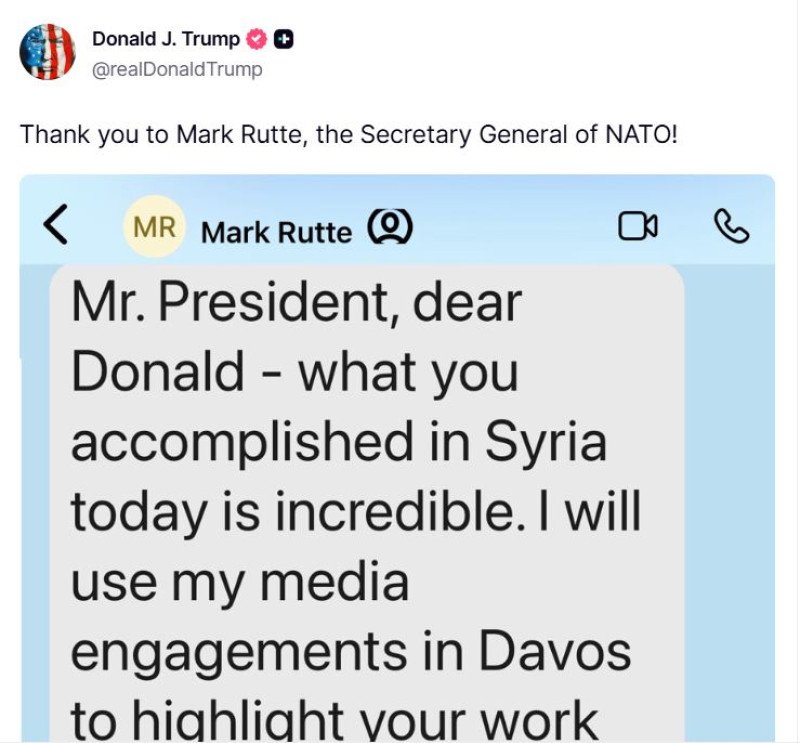 Preşedintele american Donald Trump a publicat marţi, pe reţeaua sa de Truth Social, o serie de mesaje în care a anunțat că a discutat cu secretarul general al NATO, Mark Rutte, a convenit organizarea unei întâlniri la Davos pe tema Groenlandei și a făcut public un presupus mesaj privat primit de la președintele Franței, Emmanuel Macron. În același timp, Trump a distribuit o hartă falsă a emisferei vestice și a criticat dur Marea Britanie pentru cedarea unei baze militare din Oceanul Indian, relatează Reuters și Politico.