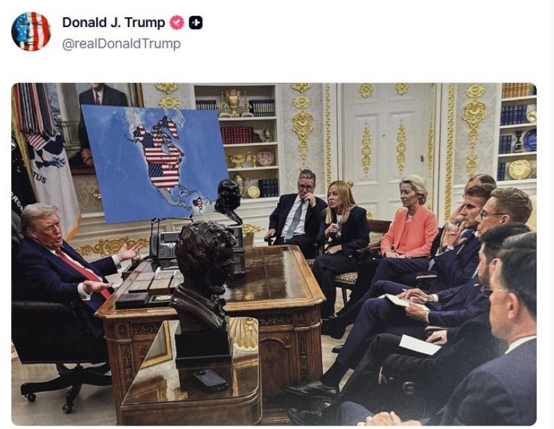 Într-un nou gest care a alimentat controversele, Trump a distribuit ulterior o hartă falsă, apărută pe fundalul unei fotografii reale realizate în timpul unei vizite a liderilor europeni la Washington, care arăta Canada, Groenlanda și Venezuela sub drapelul Statelor Unite.