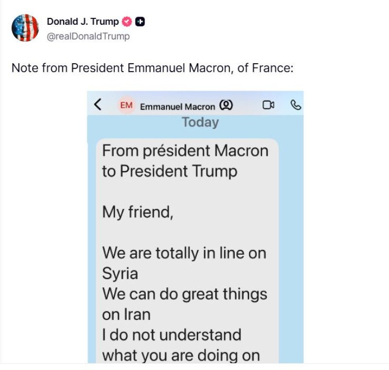 În mesajul atribuit lui Emmanuel Macron și publicat de Trump, liderul francez i-ar fi scris președintelui american: „Prietene, suntem complet aliniați pe Siria. Putem face lucruri mari în privința Iranului. Nu înțeleg ce faci în Groenlanda”.
