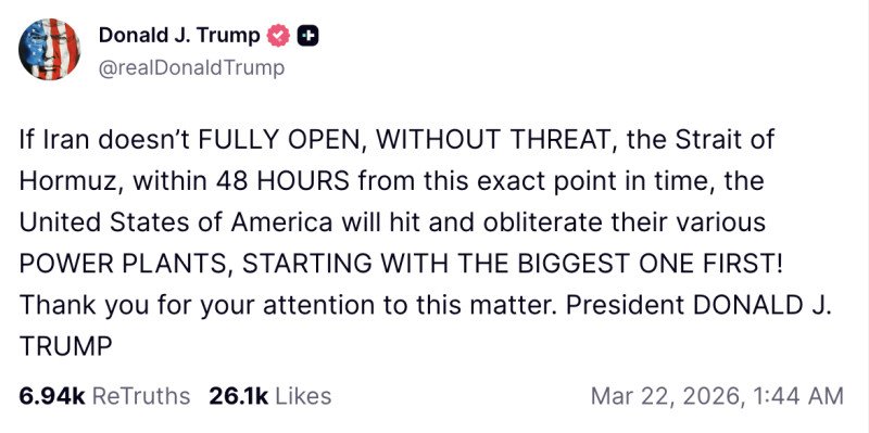 „Dacă Iranul nu redeschide TOTAL, FĂRĂ NICIUN FEL DE AMENINŢARE, strâmtoarea Ormuz în termen de 48 DE ORE de la acest moment precis, Statele Unite ale Americii vor lovi şi vor distruge diferitele sale CENTRALE ELECTRICE, ÎNCEPÂND CU CEA MAI MARE!”, a scris preşedintele american.