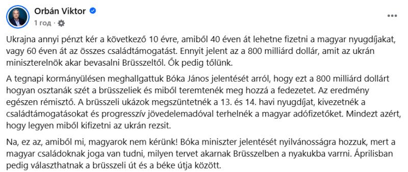 „Ucraina cere atât de mulți bani în următorii 10 ani, încât această sumă ar putea fi folosită pentru a plăti pensiile maghiare timp de 40 de ani sau pentru a finanța toate programele de sprijin familial timp de 60 de ani. Asta înseamnă cei 800 de miliarde de dolari pe care premierul ucrainean vrea să-i obțină de la Bruxelles. Iar ei, la rândul lor, vor să-i obțină de la noi”, a scris premierul maghiar.