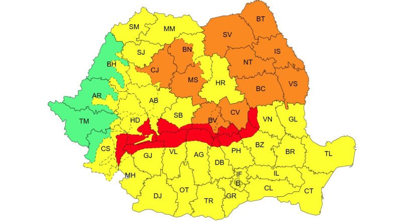 Meteorologii au emis un cod Roșu de ninsori însoțite de vânt foarte puternic și vizibilitate aproape de zero în Carpații Meridionali și de Curbură, la altitudini de peste 1.700 de metri altitudine. Rafelele vor putea ajunge și la 120 km/h.